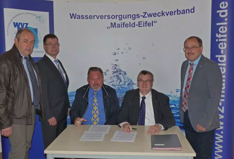 Verbandsbürgermeister Gerd Heilmann, Verbandsvorsteher WVZ Landrat Dr. Alexander Saftig, Ortsbürgermeister Michael Stephani, Werkleiter WVZ Jürgen Wagner und Werkleiter Abwasserwerk VG Vordereifel Matthias Steffens bei der Vertragsunterzeichnung (v.r.n.l.)