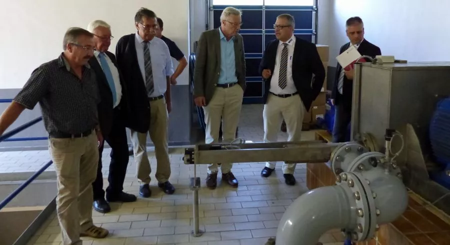 Staatssekretär Dr. Thomas Griese (2. v. l.) vom Ministerium für Umwelt, Energie, Ernährung und Forsten überreicht im Wasserwerk Kruft die Förderbescheide.